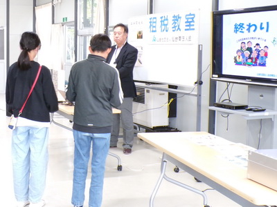 青年部会(高橋建隆朗部会長)では、10月7日(火)午前10時35分から仙台市立上野山小学校で「租税教室」を行いました。講師には、関村実事務局長が担当し、6年生81名を対象に税の使われ方、税の種類を一緒になって勉強しました。今回は仙台南税務署より西崎由美子署長、大久保英樹副署長、楠美麻生法人課税第一部門統括国税調査官が見学に来られました。