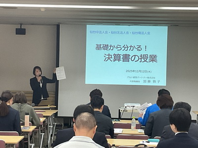 令和7年11月12日(水)午後1時30分から青葉区:戦災復興記念館5階会議室において仙台市内三会合同研修会「基礎から分かる決算書の授業講座」が開催されました。講師には中小企業診断士・アルト経営パートナー(株)代表 加藤敦子氏をお迎えし、三法人会より約56名の参加をいただきました。