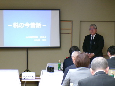 今年度は4支部合同で11月11日(火)午後5時より岩沼市ホテル桃幸において「税務研修会」を行いました。仙台南税務署副署長 大久保英樹氏を招き「税の今昔物語」と題して研修を行いました。