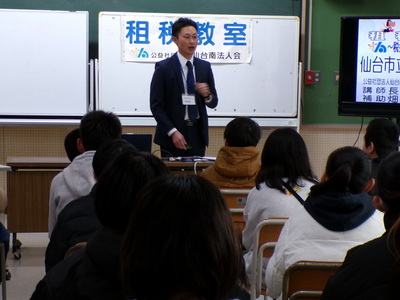 青年部会(高橋建隆朗部会長)では、1月15日(木)午前9時40分から仙台市立鹿野小学校で「租税教室」を行いました。講師には、長嶋秀一副部会長が担当し、6年生56名を対象に税の使われ方、税の種類を一緒になって勉強しました。